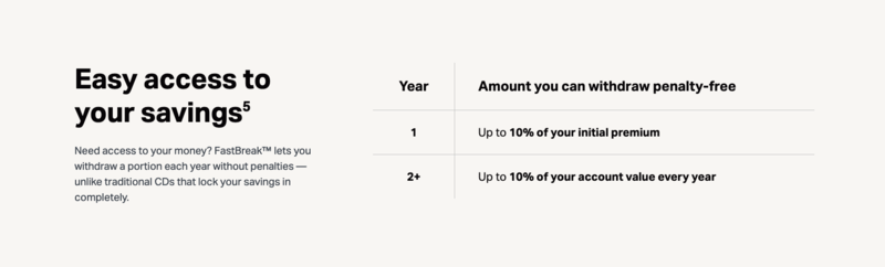According to Gainbridge, the FastBreak™ annuity is ideal for individuals focused on medium to long-term savings goals who want the flexibility to access their money if needed, before reaching retirement age. With its competitive APY and penalty-free early withdrawal feature, it’s a good fit for those seeking steady growth with financial flexibility.