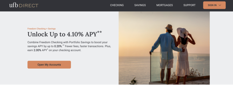 Opening a Freedom Checking account with a Portfolio Savings account offers up to 4.10% APY.** Combining these accounts can increase your savings APY by up to 0.20%.** Additionally, the Freedom Checking account provides 2.00% APY.* (Checking rates 25x the national average.†) UFB Direct also features fewer fees and faster transaction processing.